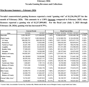 Nevada Gaming Control Board reported Laughlin Gaming Revenue was Down by -8.83% in February 2026 compared to the same period in 2025.