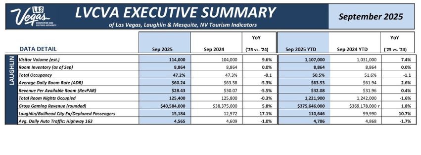 September Visitor Numbers in Laughlin, as released by the LVCVA, showed a 9.6% increase in September (2025) compared to September of last year.